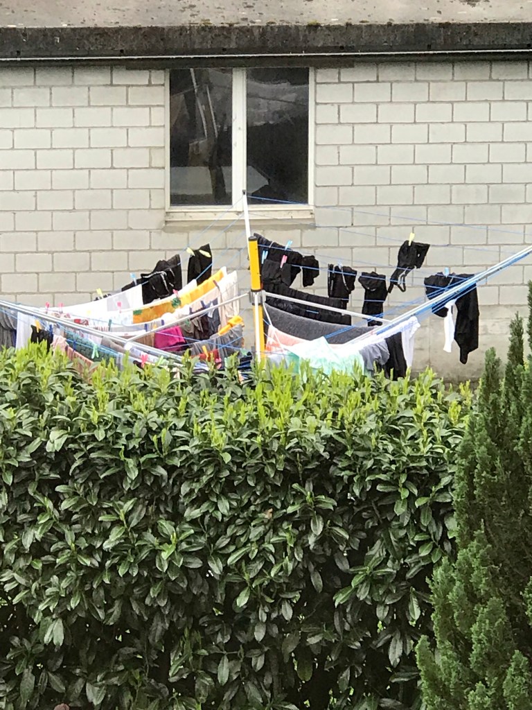 Seit nun mindestens zwei Wochen steht der Wäscheständer gegenüber von meinem Wohnzimmer vor dem Nachbarhaus. Tag und Nacht, mit immer der selben Wäsche drauf.